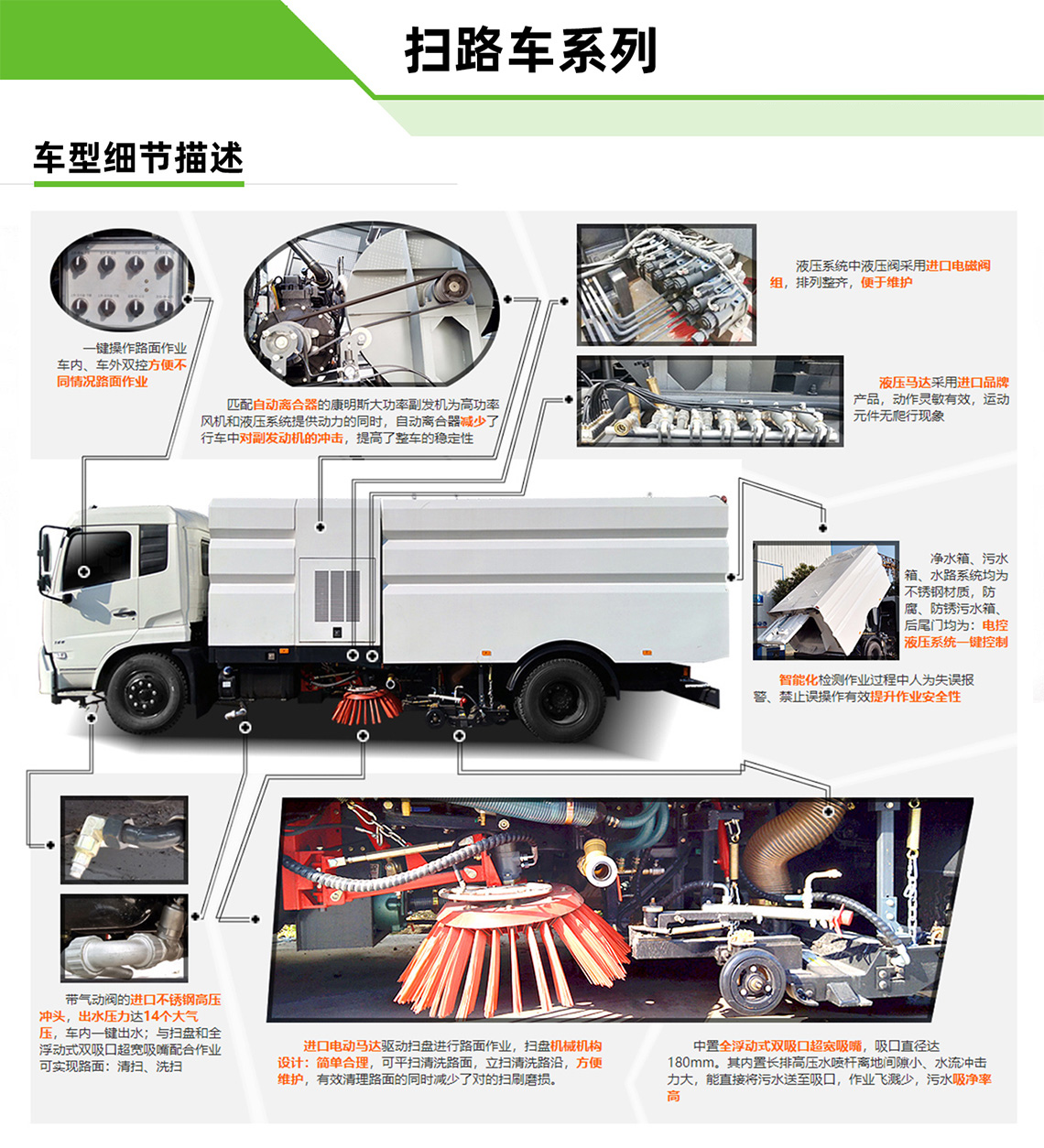 帶掃盤4把,江鈴副發(fā)動(dòng)機(jī);大力馬達(dá);施耐德控件開關(guān);臺(tái)灣電磁閥組;免維護(hù)自分離式離合器;免維護(hù)風(fēng)機(jī);不銹鋼水箱;不銹鋼垃圾箱;尾部LED箭頭燈;手動(dòng)泵應(yīng)急系統(tǒng);刷臂轉(zhuǎn)動(dòng)機(jī)構(gòu)使用高新耐磨工程隔套,免打黃油;精密冷彎無(wú)縫液壓油管。