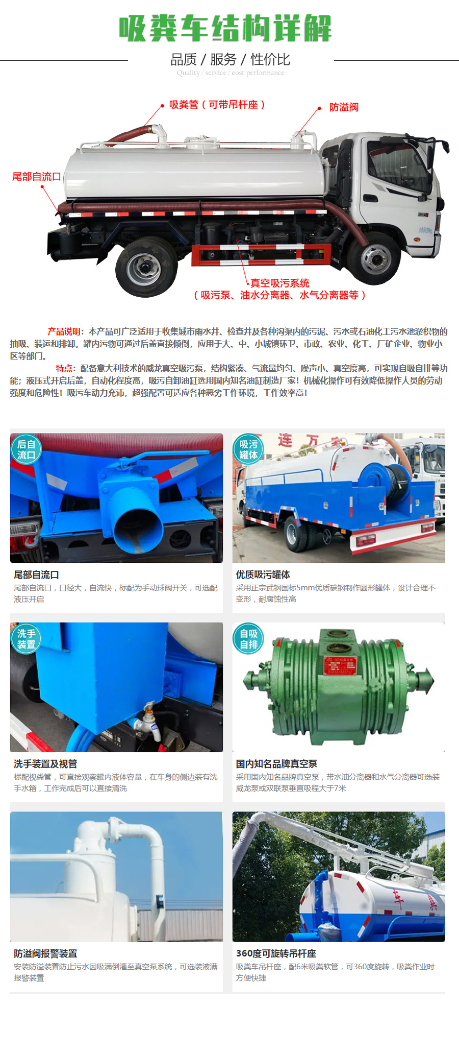 【選裝配置】選裝進(jìn)口真空吸糞泵、水循環(huán)泵,選裝不銹鋼罐體,罐體防腐、聚乙烯襯塑處理。加裝抽水泵可具備灑水車部分功能,用于園林綠化、環(huán)衛(wèi)保潔灑水作業(yè)。
