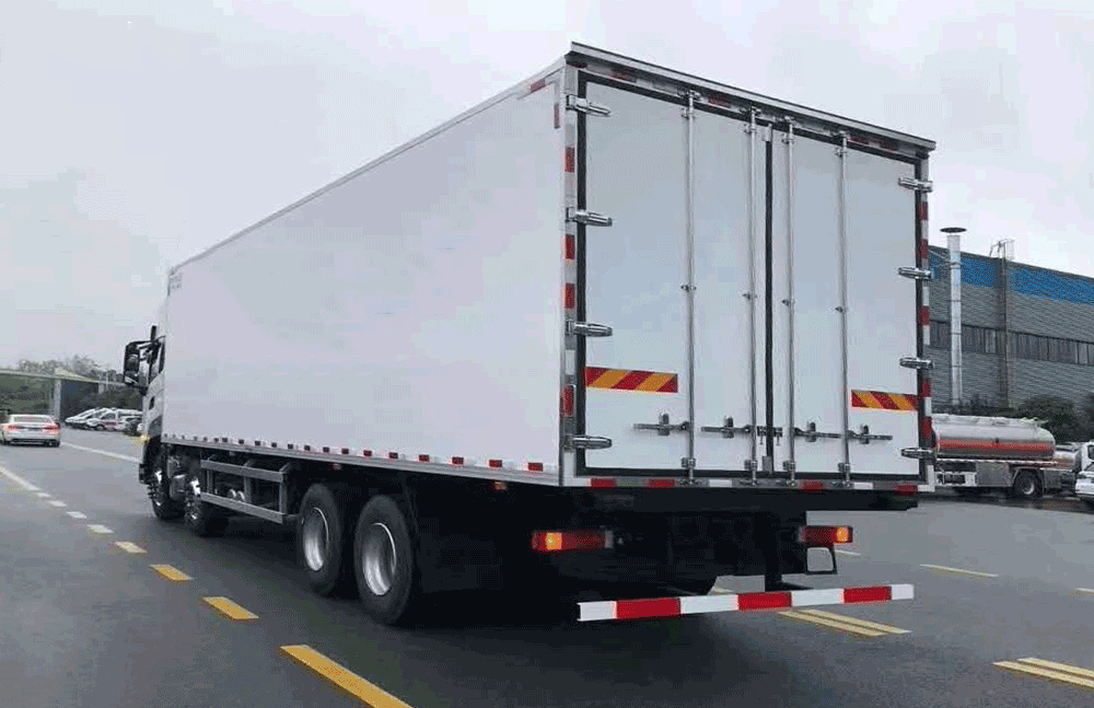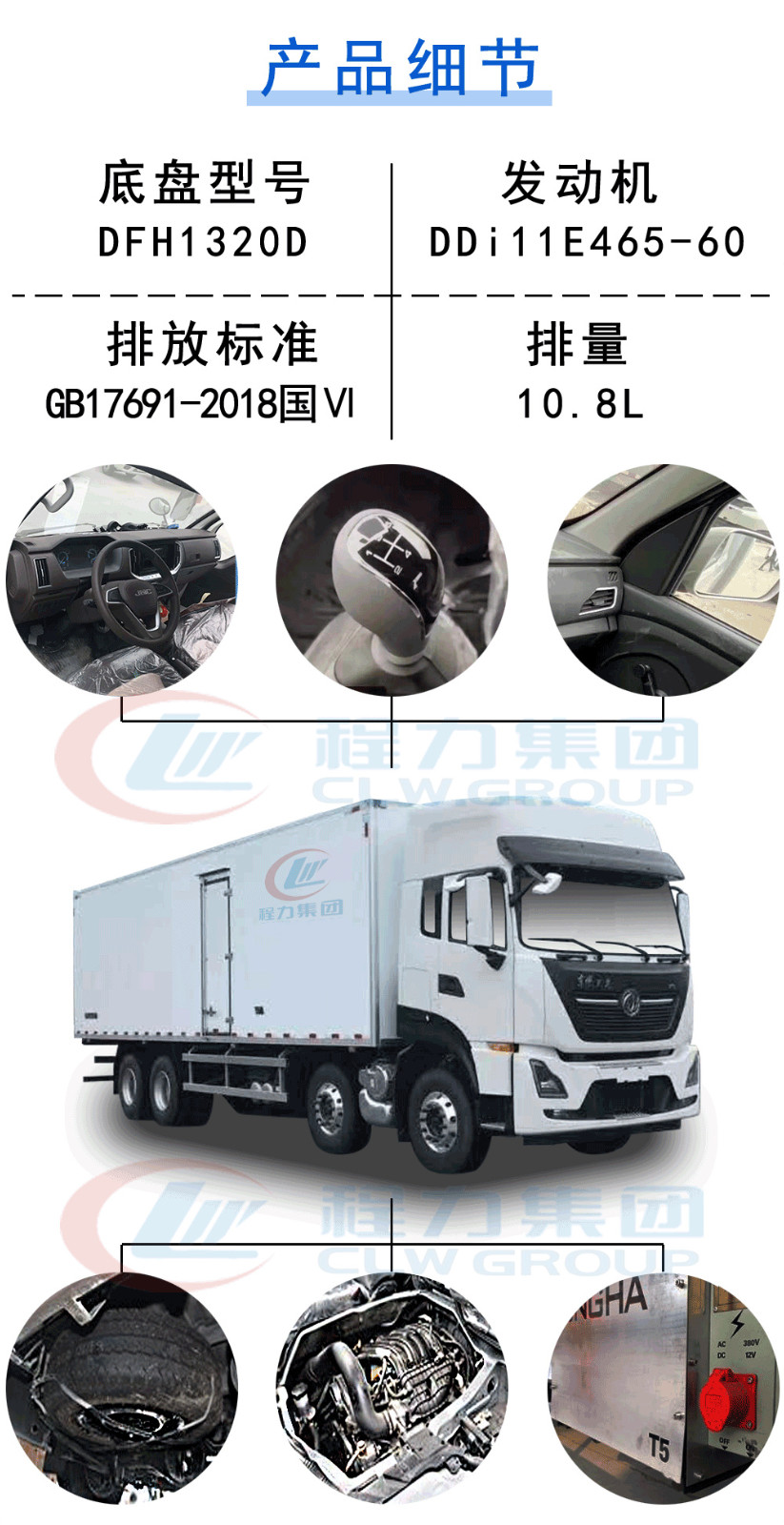 | 其他 | 隨底盤(pán)選裝僅高度不同的駕駛室,高頂駕駛室頂部氣喇叭為選裝件,駕駛室前角擾流板為選裝件,選裝單油箱或雙油箱;貨廂選裝單開(kāi)門(mén),雙開(kāi)門(mén)和不開(kāi)門(mén)型式;選裝其它廠家功率相當(dāng)?shù)闹评錂C(jī)組,選裝前置式,內(nèi)置式,底置式制冷機(jī)組;選裝升降尾板,尾板收起狀態(tài)時(shí)的水平長(zhǎng)度為295mm;廂體頂部封閉,不可開(kāi)啟;側(cè)防護(hù):材料Q235,螺栓連接;后下防護(hù):材質(zhì)Q235.螺栓連接,斷面尺寸120×60mm,離地高度460mm;安裝具有衛(wèi)星定位功能的行駛記錄儀;裝有ABS,ABS型號(hào)/生產(chǎn)廠家:ABS 8/東科克諾爾商用車制動(dòng)系統(tǒng)(十堰)有限公司;發(fā)動(dòng)機(jī)DDi11E465-60對(duì)應(yīng)油耗申報(bào)值37.1L/100km. | ||