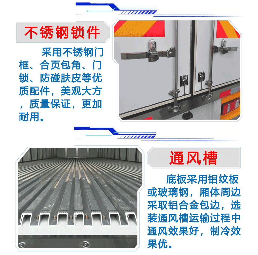 箱體一般標(biāo)配內(nèi)外采用2.2mm優(yōu)質(zhì)玻璃鋼材質(zhì),中間8cm聚氨酯發(fā)泡保溫層,廂體底板材質(zhì)采用花紋防滑鋁底板,配不銹鋼門鎖件。